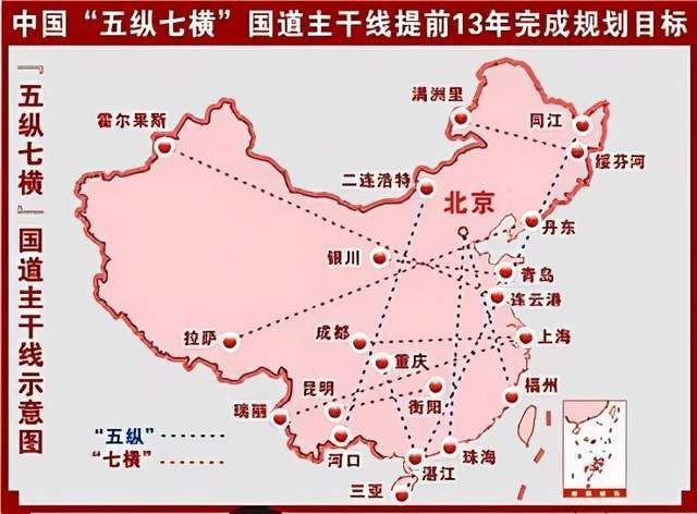 “五縱”指同江—三亞、北京—珠海、重慶—北海、北京—福州、二連浩特—河口?!捌邫M”指連云港—霍爾果斯、上海—成都、上?!瘥悺⒑怅枴ッ?、青島—銀川、丹東—拉薩、綏芬河—滿洲里。