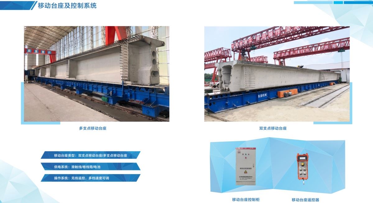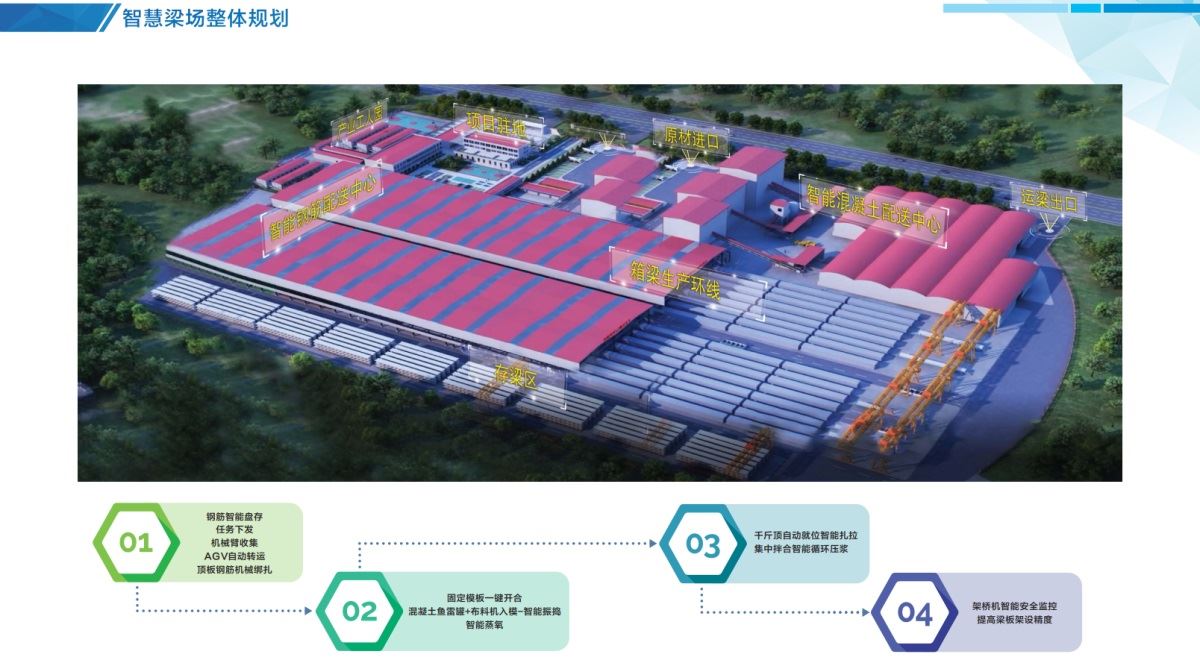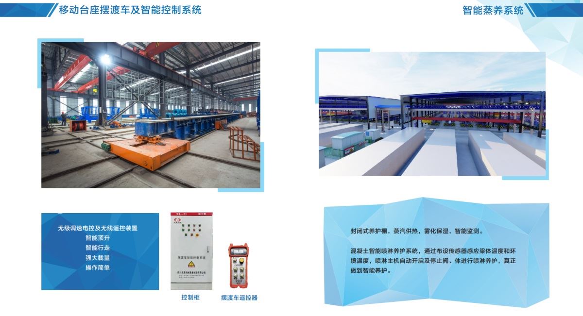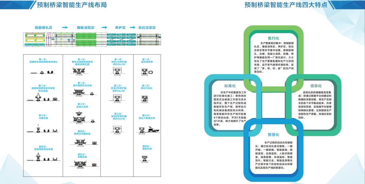 預(yù)制橋梁智能生產(chǎn)線(xiàn)新技術(shù)采用了“施工工序區(qū)域固定、流水線(xiàn)作業(yè)”的預(yù)制新模式:通過(guò)自行式移動(dòng)臺(tái)座將鋼筋綁扎區(qū)、模板澆筑區(qū)、養(yǎng)護(hù)區(qū)、張拉壓漿區(qū)和存梁區(qū)有機(jī)串聯(lián),實(shí)現(xiàn)橋梁預(yù)制施工的工廠(chǎng)化流水線(xiàn)作業(yè)。