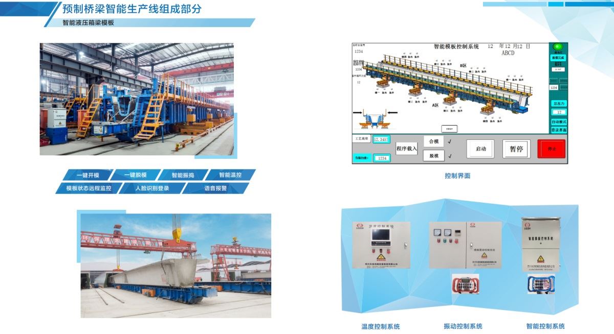 生產(chǎn)過(guò)程的自動(dòng)化和智能化:通過(guò)自動(dòng)化液壓模板、一鍵開(kāi)模、一鍵脫模、智能振搗、智能溫控、遠(yuǎn)程監(jiān)控、人臉識(shí)別登錄、語(yǔ)音報(bào)警、無(wú)線(xiàn)遙控、智能頂升、智能行走、智能監(jiān)測(cè)等生產(chǎn)過(guò)程中各個(gè)階段的自動(dòng)化和智能化實(shí)現(xiàn)生產(chǎn)線(xiàn)的智慧化。